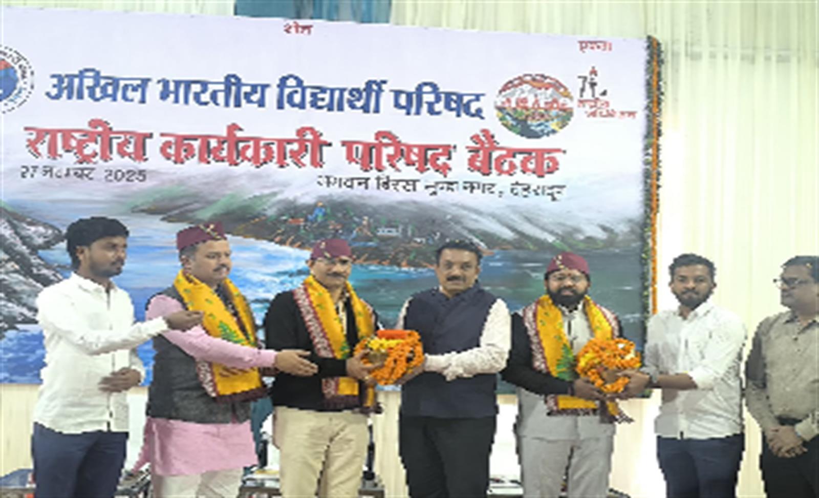 अखिल भारतीय विद्यार्थी परिषद (अभाविप) की एक-दिवसीय राष्ट्रीय कार्यकारी परिषद बैठक देहरादून के परेड ग्राउंड में बसाए गए भगवान बिरसा मुंडा नगर में बृहस्पतिवार को संपन्न हुई। बैठक का शुभारंभ अखिल भारतीय विद्यार्थी परिषद के राष्ट्रीय अध्यक्ष प्रो राजशरण शाही, राष्ट्रीय महामंत्री डॉ वीरेंद्र सिंह सोलंकी तथा राष्ट्रीय संगठन मंत्री आशीष चौहान की उपस्थिति में हुआ। इस दौरान राष्ट्रीय स्वयंसेवक संघ के सह-सरकार्यवाह माननीय मुकुंद सी.आर. जी की भी गरियामई उपस्थिति रही। इस महत्वपूर्ण बैठक में विद्यार्थी परिषद की संगठनात्मक संरचना के अनुसार 46 प्रांतों से कुल 468 प्रतिनिधि अपेक्षित हैं।